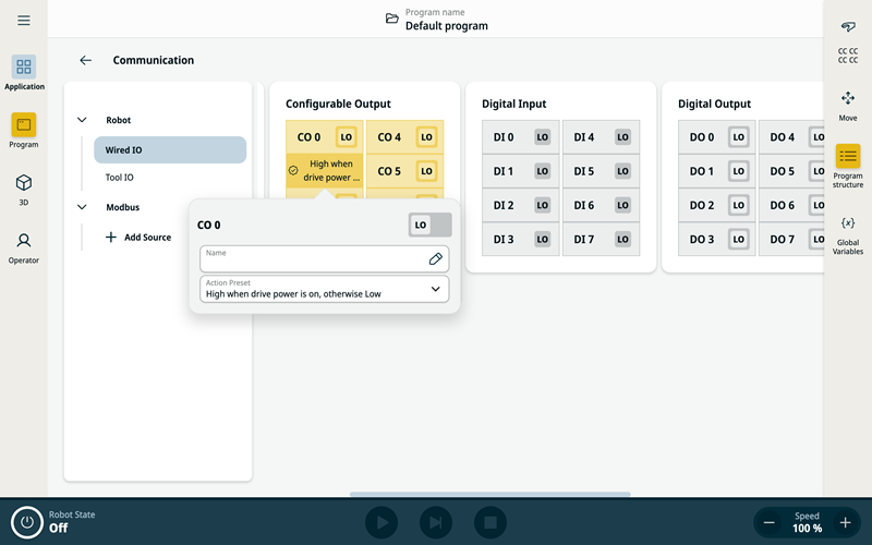 New I/O actions for outputs are now available to signal whether the robot's drive units are powered on or off.