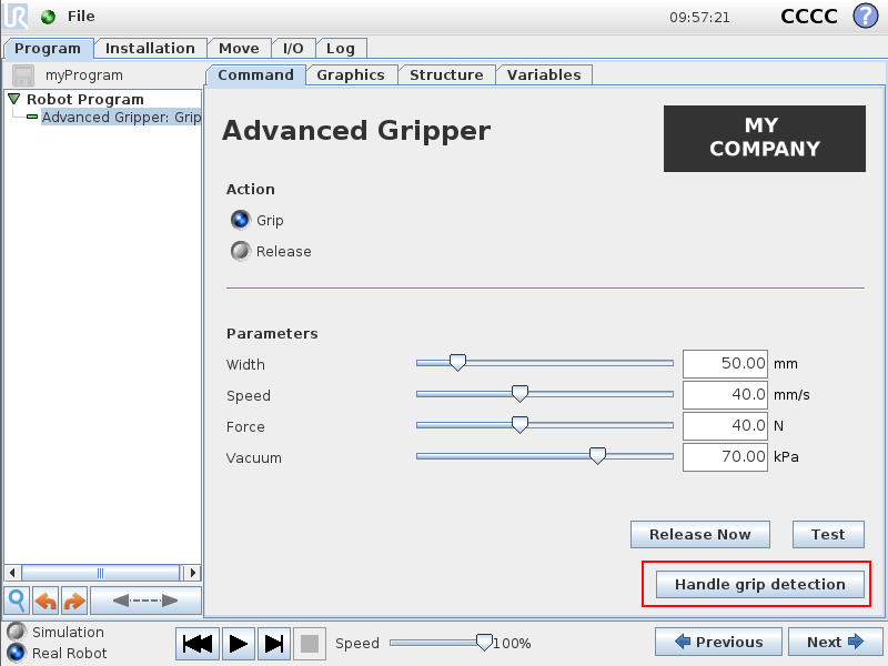 - When one or both of these capabilities are registered, the user will be able to enable handling of grip/release detection in the Gripper program node. This provides the possibility of: