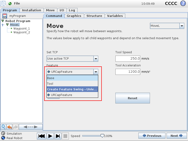 - Features contributed by URCaps are grouped by the URCap "owner" in terms of the name of the URCap and its developer in all drop-down lists in programs Nodes where a Feature can be selected, e.g. 'Move'? Nodes. User-defined Features are listed in the top of the feature drop-down lists followed by features added by URCaps.