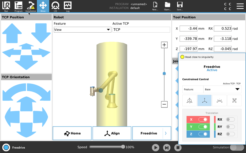 Constrained Freedrive mode with user supplied parameters can be activated in program. Script function has equivalent functionality to Freedrive available in PolyScope GUI.