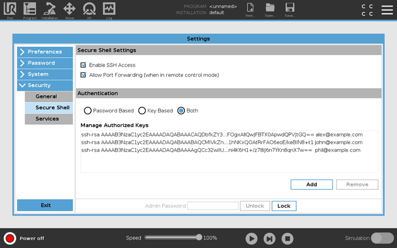 - Enabling/disabling remote access to the standard services of the robot such as the Dashboard Server and the Primary/secondary client interfaces