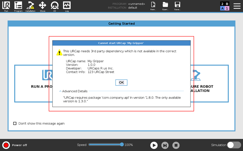 - In the URCap Settings screen, the URCap with the startup error is indicated with an error status icon in the "Active URCaps" list and the error message is provided in the top of the "URCap Information" panel.