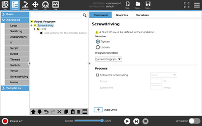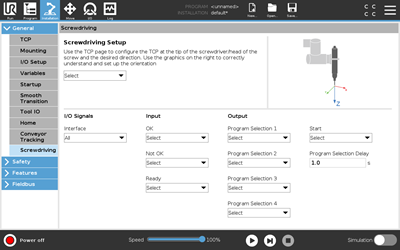 - Screwdriving: New Screwdriving program node provides an easy way to add a screwdriving application for an attached industrial screwdriver. The screwdriver parameters and interface to the robot are defined in the PolyScope Installation Tab.