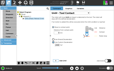 - Added new Until Tool Contact node. Actions added under the Until node will run until the?embedded force torque sensor in the robot's tool flange will detect an impact.