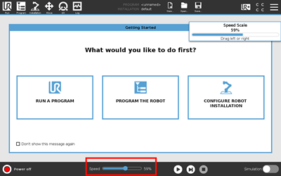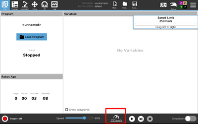- Program speed can now be more easily adjusted by dragging left/right anywhere on the slider. A popup will show the new speed. Manual high speed is now accessed via a new icon with similar dragging functionality and popup. It replaces the old incremental pressing on the slider. There is a new Three Position tab under Safety for enabling/disabling manual high speed.