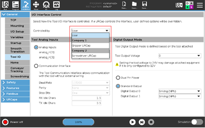 - Added support for selecting who controls the settings of the Tool I/O Interface. Available options are the end user or any of the URCaps that has requested the control.
