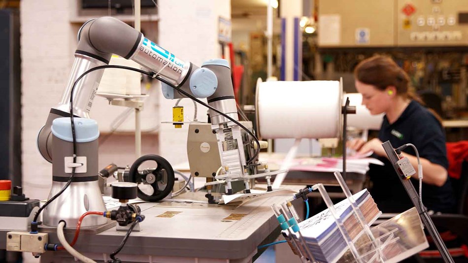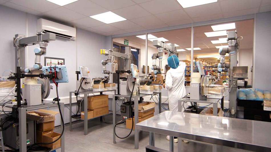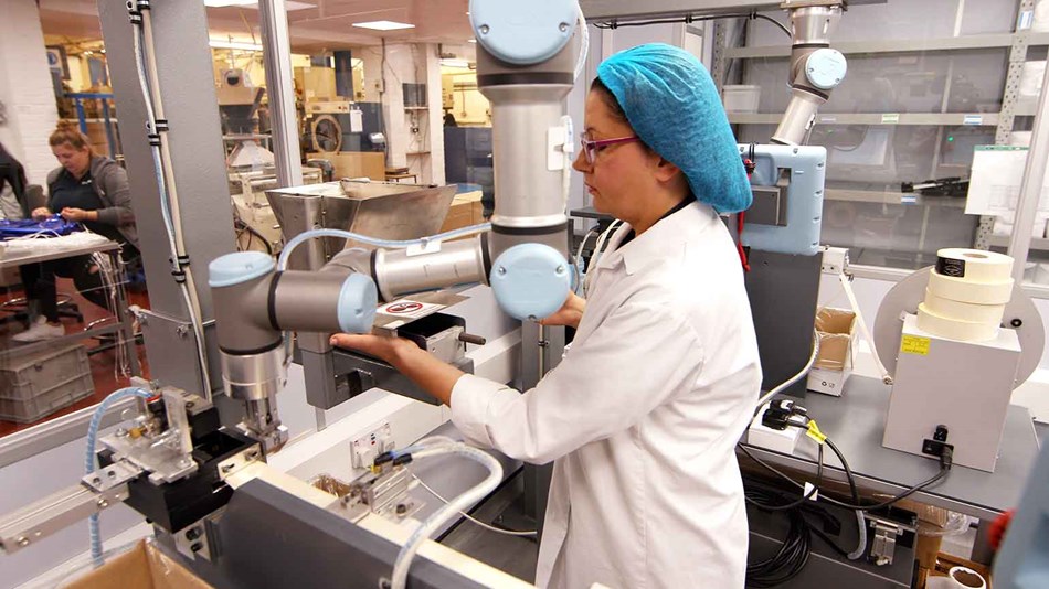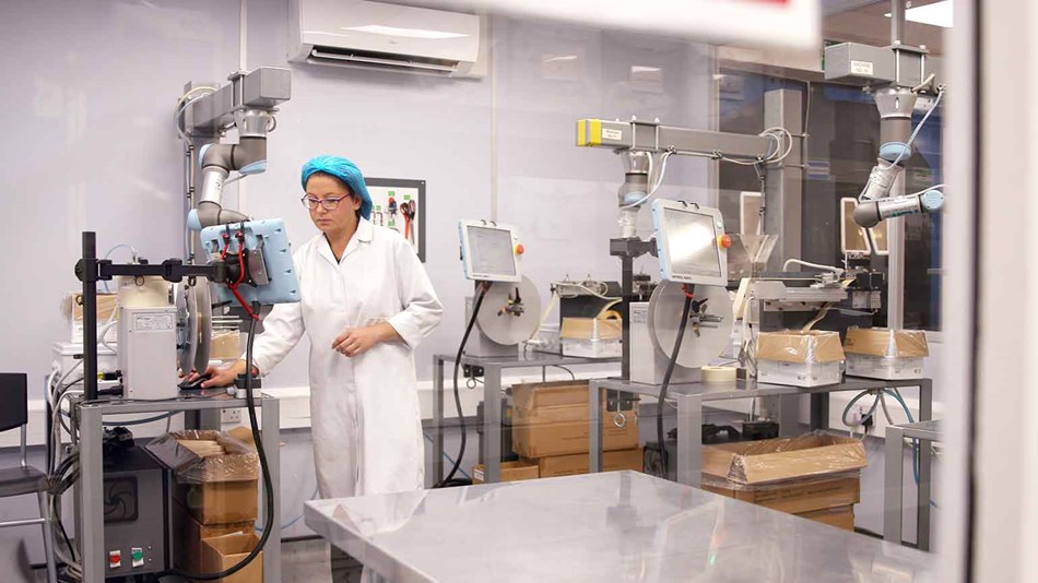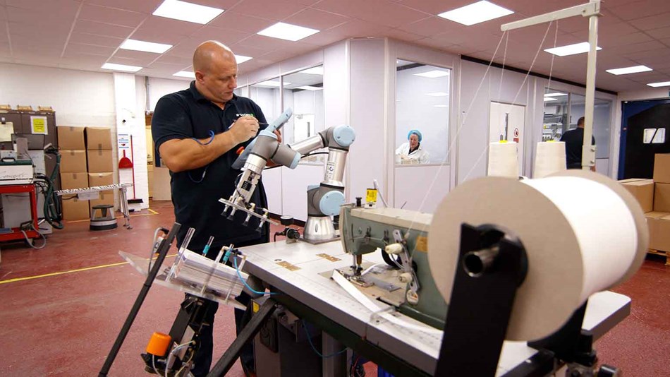 B-Loony Ltd.是一家英國的中小型制造商,主要生產(chǎn)食品彩旗、旗布和氣球等促銷產(chǎn)品。該公司部署了6臺UR3協(xié)作式機器人來完成縫紉、氣球吹氣和產(chǎn)品組裝等工序,開啟自動化生產(chǎn)模式后,該公司得以在英國市場站穩(wěn)腳跟,快速響應客戶需求,在保持自身競爭力的同時進一步擴大了市場份額。采購協(xié)作式機器人后,B-Loony Ltd.現(xiàn)可年產(chǎn)近200萬米的旗布,并將食品彩旗的產(chǎn)能從每年25萬面提高到了1,500萬面。