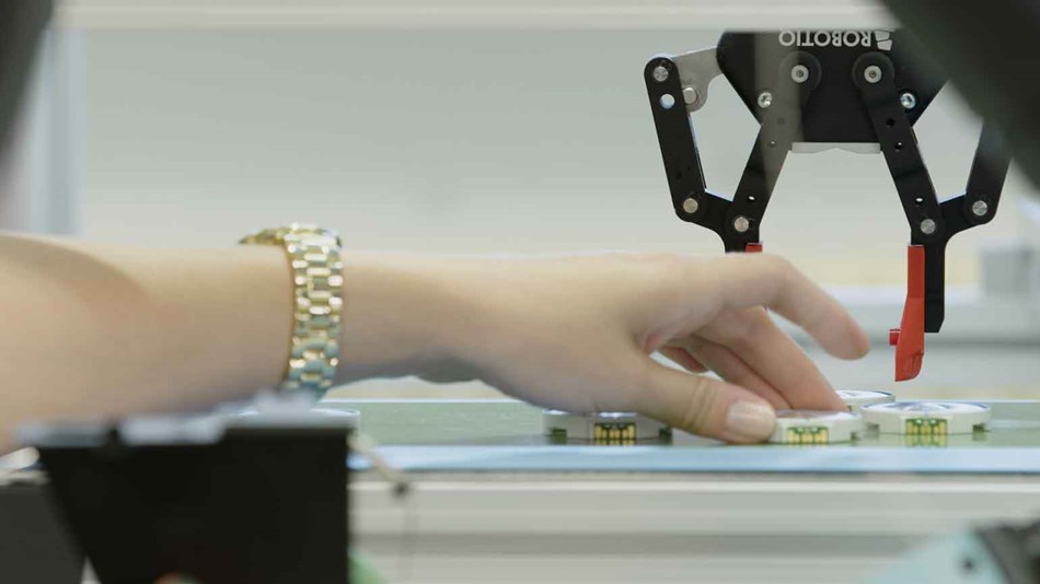 優(yōu)傲機器人長久以來在質量控制應用上的表現終于讓拜亞動力信服了,公司決定在生產區(qū)域也部署上可靠的協(xié)作式機器人。如今,拜亞動力在揚聲器振膜涂層工序上設置了兩臺優(yōu)傲協(xié)作式機器人,分別是 UR3 和 UR5,為負責該工序的員工提供支持。一名員工負責將焊接好的耳機揚聲器放在預定區(qū)域,該區(qū)域正好位于機械臂攝像頭視場范圍內。在 Robotiq 腕部攝像頭和 Robotiq 二指夾爪的協(xié)助下,UR5 機械臂拾取揚聲器,然后把它放置在旋轉電機上。然后,由一臺裝有集成式噴槍的 UR3 向振膜上噴涂分散介質。然后,UR5 使用 Robotiq 夾爪將涂好的揚聲器放置在一個托盤上,托盤裝滿后,機器人就會自動將其向前推進。