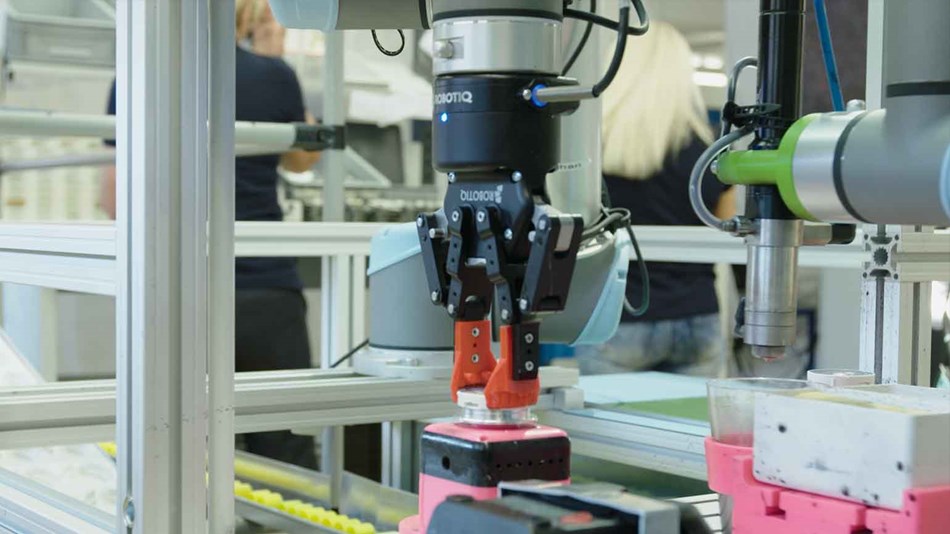 為了提高生產率,同時改善音響設備的質量,拜亞動力采用協(xié)作式機器人進行揚聲器振膜涂層操作。為了實現自動化,它首先將工藝分為搬運和噴涂兩部分。在拾取和放置應用中,一臺集成了 Robotiq 腕部攝像頭和 Robotiq 二指夾爪的 ur5 機器人負責將焊接好的耳機揚聲器放在旋轉的電機上。然后,由一臺裝有集成式噴槍的 UR3 向振膜上噴涂分散介質。協(xié)作式機器人不僅使得該生產環(huán)節(jié)的效率提高了 50%,還顯著提高了產品質量。