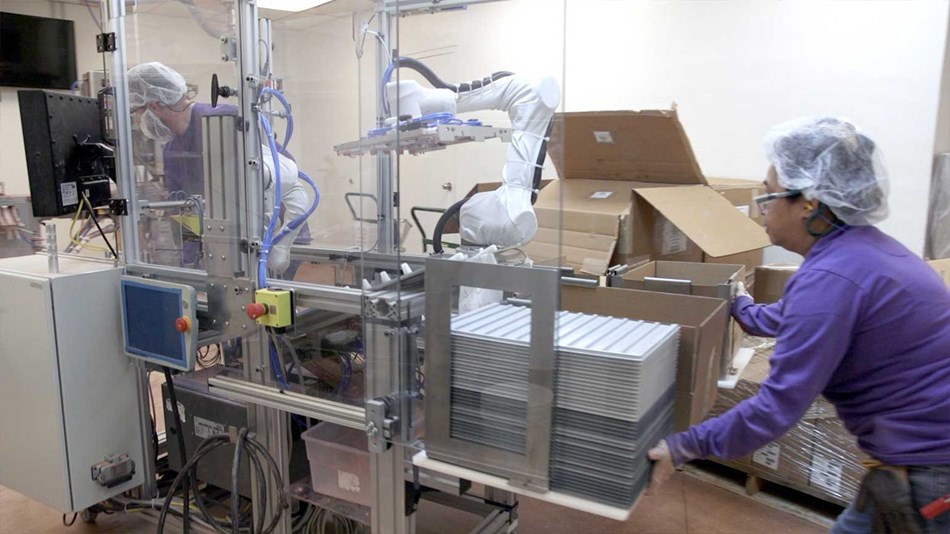 協(xié)作式機(jī)器人是為了與工作人員安全地協(xié)同作業(yè)而設(shè)計(jì)的。然而,為了滿足既定的生產(chǎn)速度,科蒂需要將機(jī)器人的速度和力量提升至協(xié)作限值以上。為了保護(hù)操作人員,Sydorko增設(shè)了輕質(zhì)樹(shù)脂玻璃防護(hù)欄和光幕。這些防護(hù)措施不會(huì)阻礙推車的移動(dòng),但一旦工作人員打開(kāi)門或穿過(guò)機(jī)器人的活躍區(qū)域,機(jī)器人會(huì)立即降至安全的協(xié)作速度。只要工作人員關(guān)上門或離開(kāi)光幕,機(jī)器人就會(huì)恢復(fù)高速。