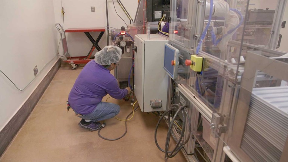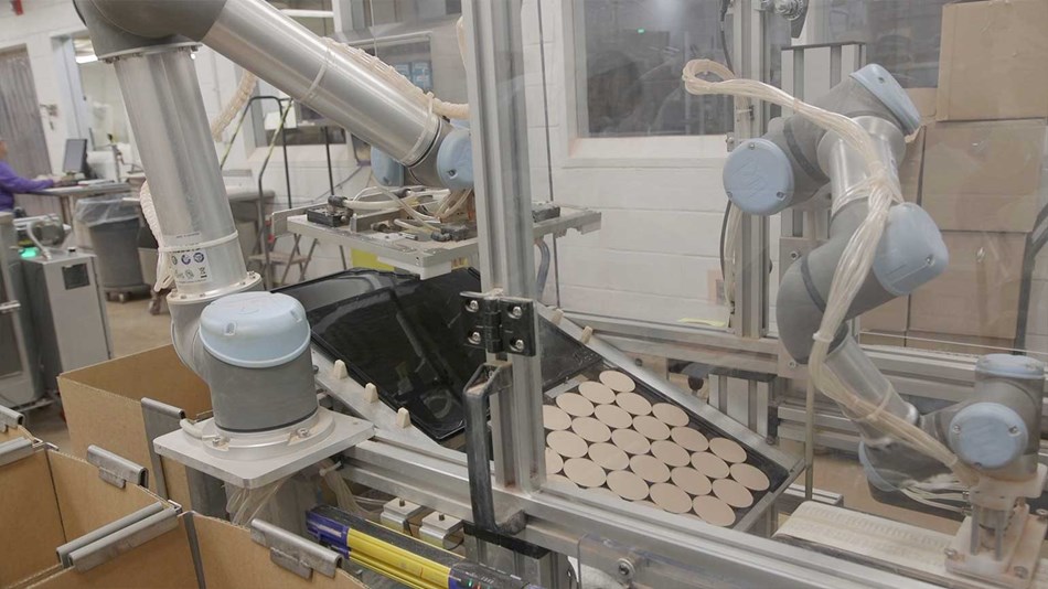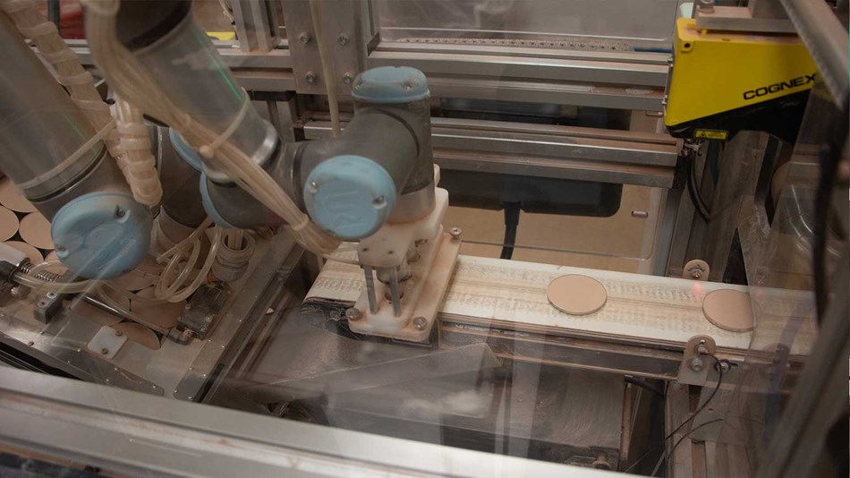 目前,這種以協(xié)作機(jī)器人為基礎(chǔ)的推車能夠操作多達(dá)10種不同的產(chǎn)品“配方”,適用于不同的粉盤形狀,如圓形、正方形或長(zhǎng)方形,同樣適用于不同的厚度和重量,每次可從壓機(jī)中取出一到兩種產(chǎn)品。這種推車機(jī)器人的設(shè)計(jì)適用于多達(dá)20種產(chǎn)品“配方”。