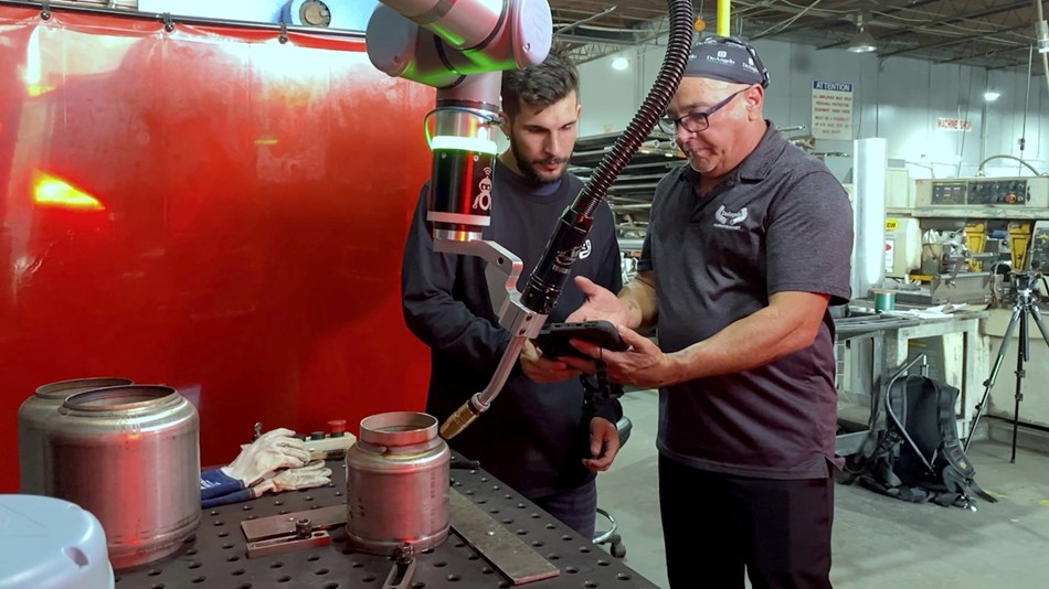 優(yōu)傲將蒙特斯介紹給焊接合作伙伴Hirebotics,其已將優(yōu)傲協(xié)作機器人納入一個完整的焊接解決方案:包括配備焊炬的UR10e機械臂、用于教學的Beacon應用程序、可靠的焊接電源和用于在各種工件上進行高質量焊接的多功能焊接臺。