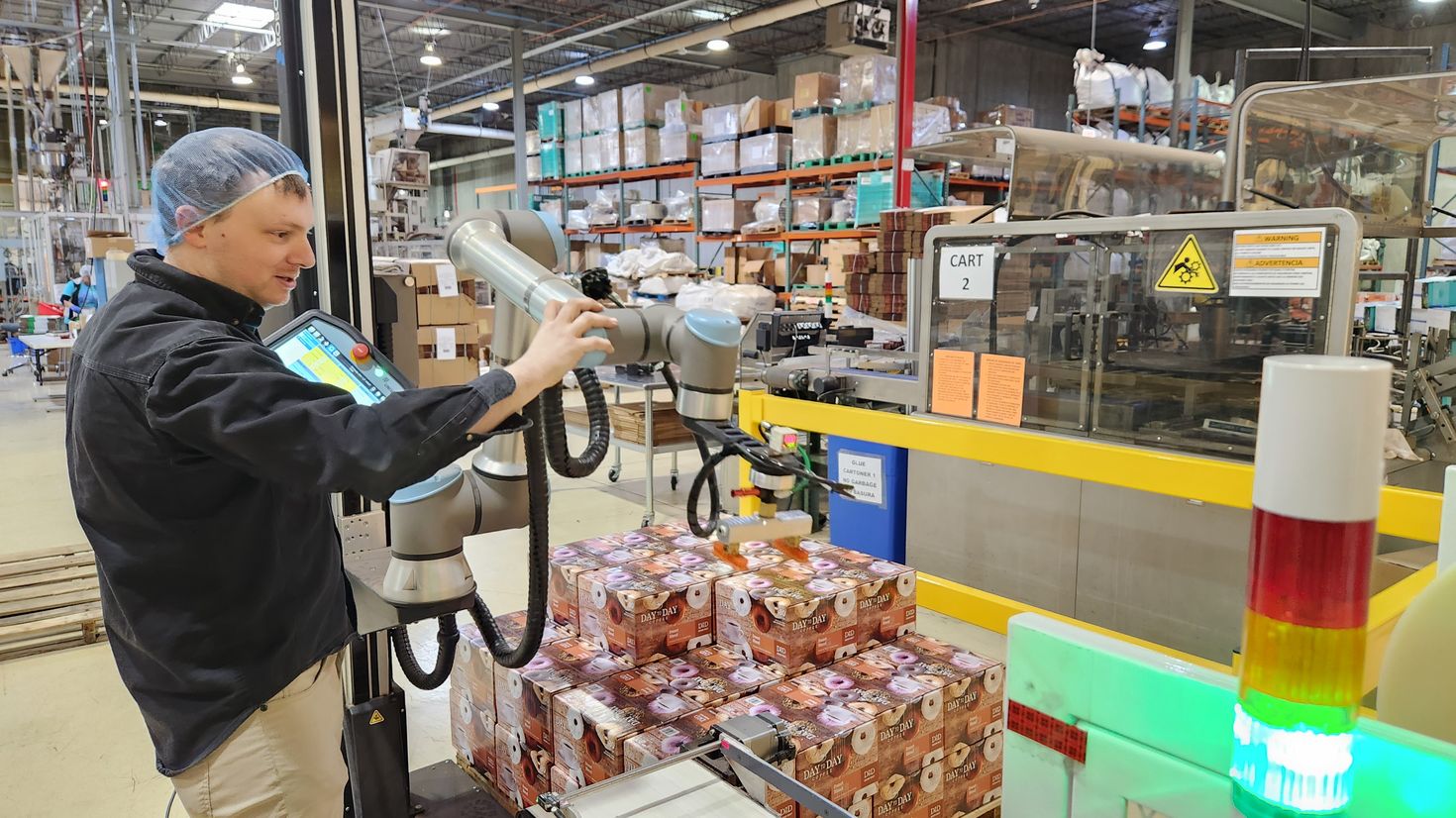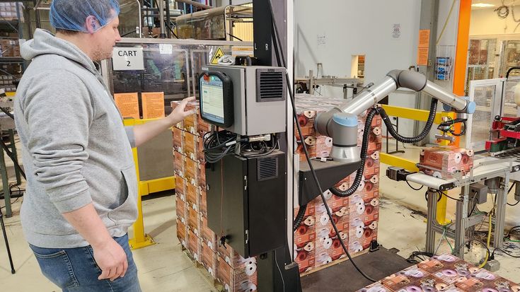 Napco Brands選擇了UR認證的系統集成商DesignHawk Innovations幫助其部署了兩臺協作機器人碼垛機——當箱子通過自動封箱機到達輸送機時,兩臺協作機器人會拾取箱子,并將其放置在托盤上。通過優(yōu)傲協作機器人自帶的觸屏示教器,輸入箱子尺寸、托盤尺寸和形狀,就能夠快速生成應用程序,模擬出準確的生產流程。