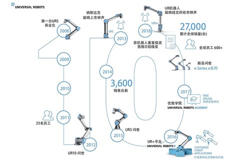 創(chuàng)新 06. 十二月 2018 / Universal Robots 優(yōu)傲機器人慶祝協作機器人發(fā)售10周年 優(yōu)傲機器人見證了十年來協作機器人的創(chuàng)舉,協作機器人從概念化產品已成為工業(yè)自動化產業(yè)中增長較快的領域。優(yōu)傲UR 持續(xù)快速增長,其協作機器人不斷幫助各行各業(yè)減低自動化進程中的障礙。